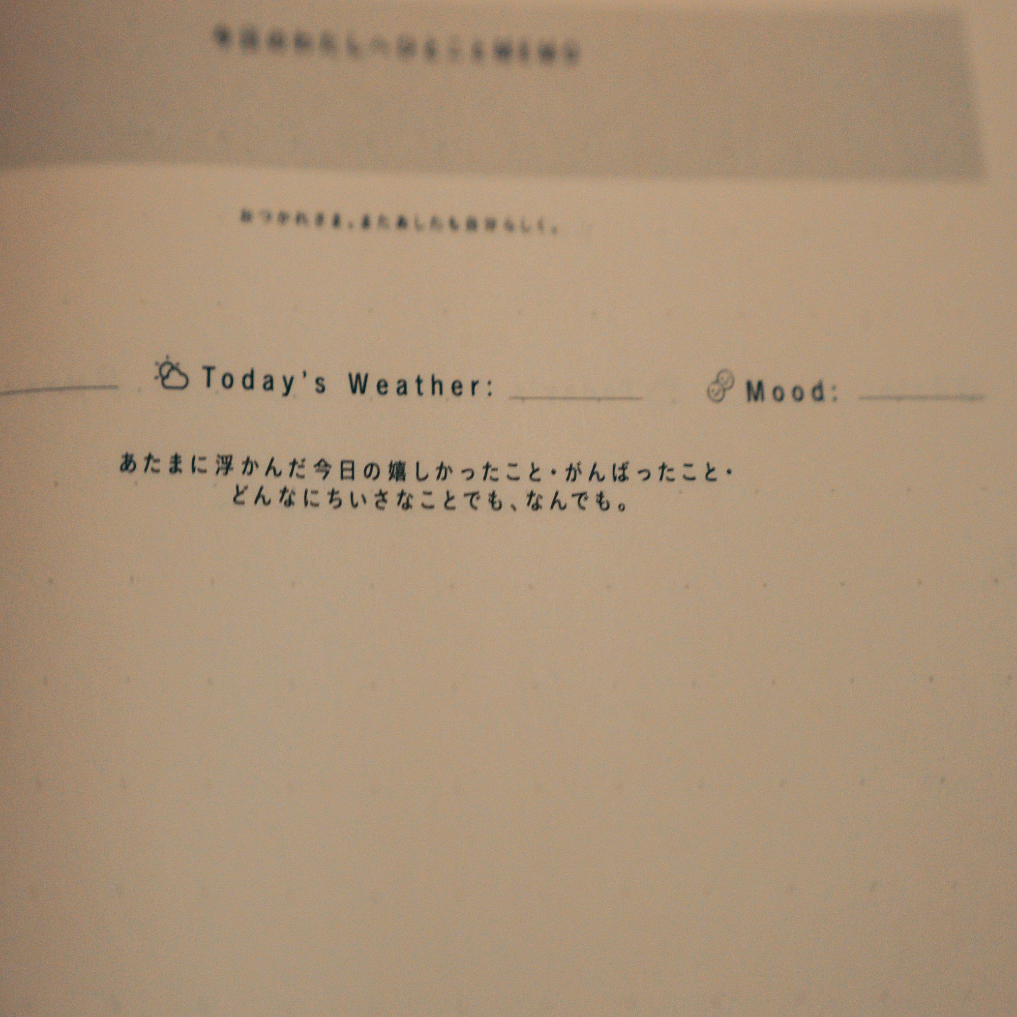ごきげん、もやもや、ちょっと疲れたなど。その日がどんな日だったのかを少しだけ覗ける欄です。天気を書くことで、「ああ今日はそういえば寒かったな。あったかい紅茶が美味しかったな」とか「そういえば落ち込んでたな。そうか、今日は無理してたのかもなあ」と小さな気づきが生まれます。